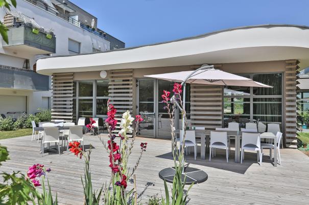 Une grande terrasse s’ouvre sur les espaces paysagés de la résidence pour profiter des extérieurs.